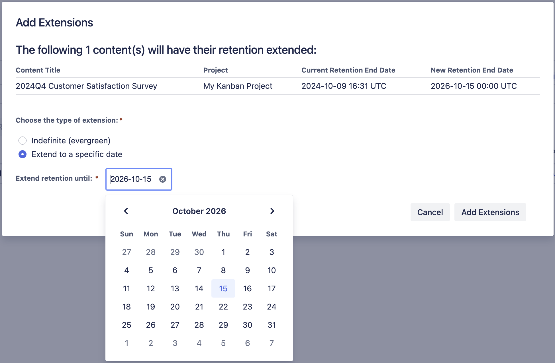 To extend the retention period for individual content, select one or more items and click Add Extension. You can also bulk edit multiple pieces of content to save time. There are two types of extensions: