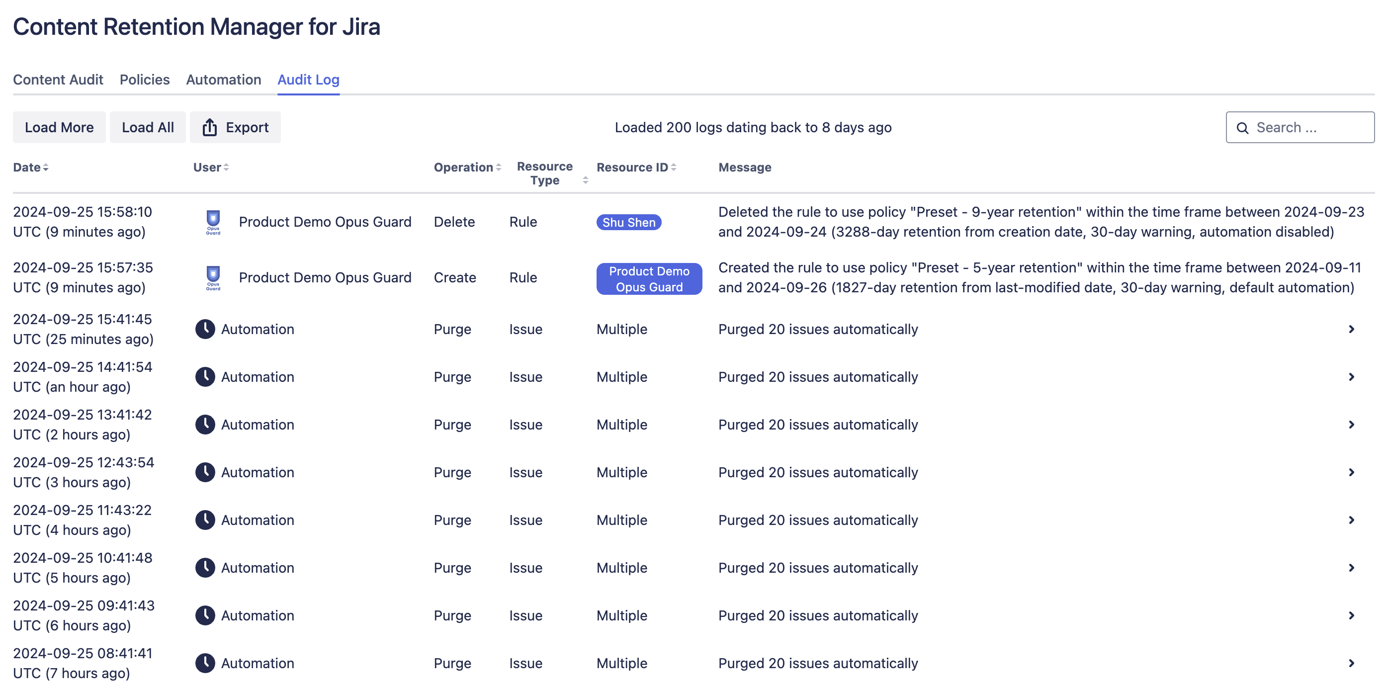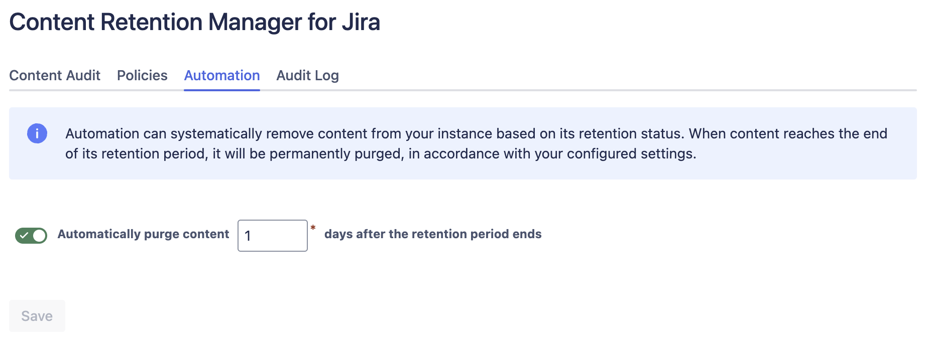 - Click Save. At this point, automation will start purging any content based on your policies and the lifecycle of the content with Atlassian Jira.