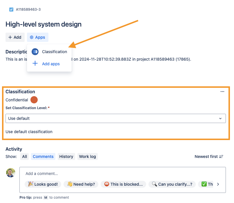 When viewing an issue, a Jira user can bring up the Classification panel by clicking the Apps button and select Classification. The Classification panel provides quick and easy access to classification details.