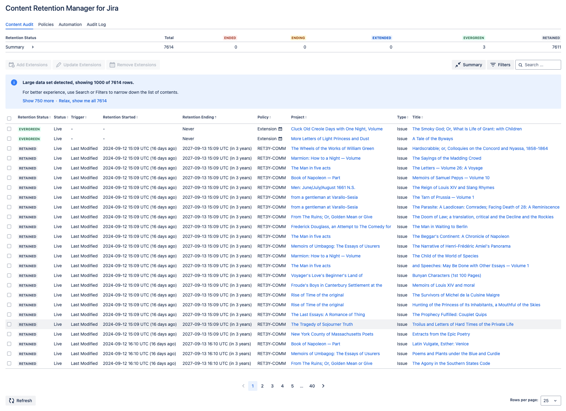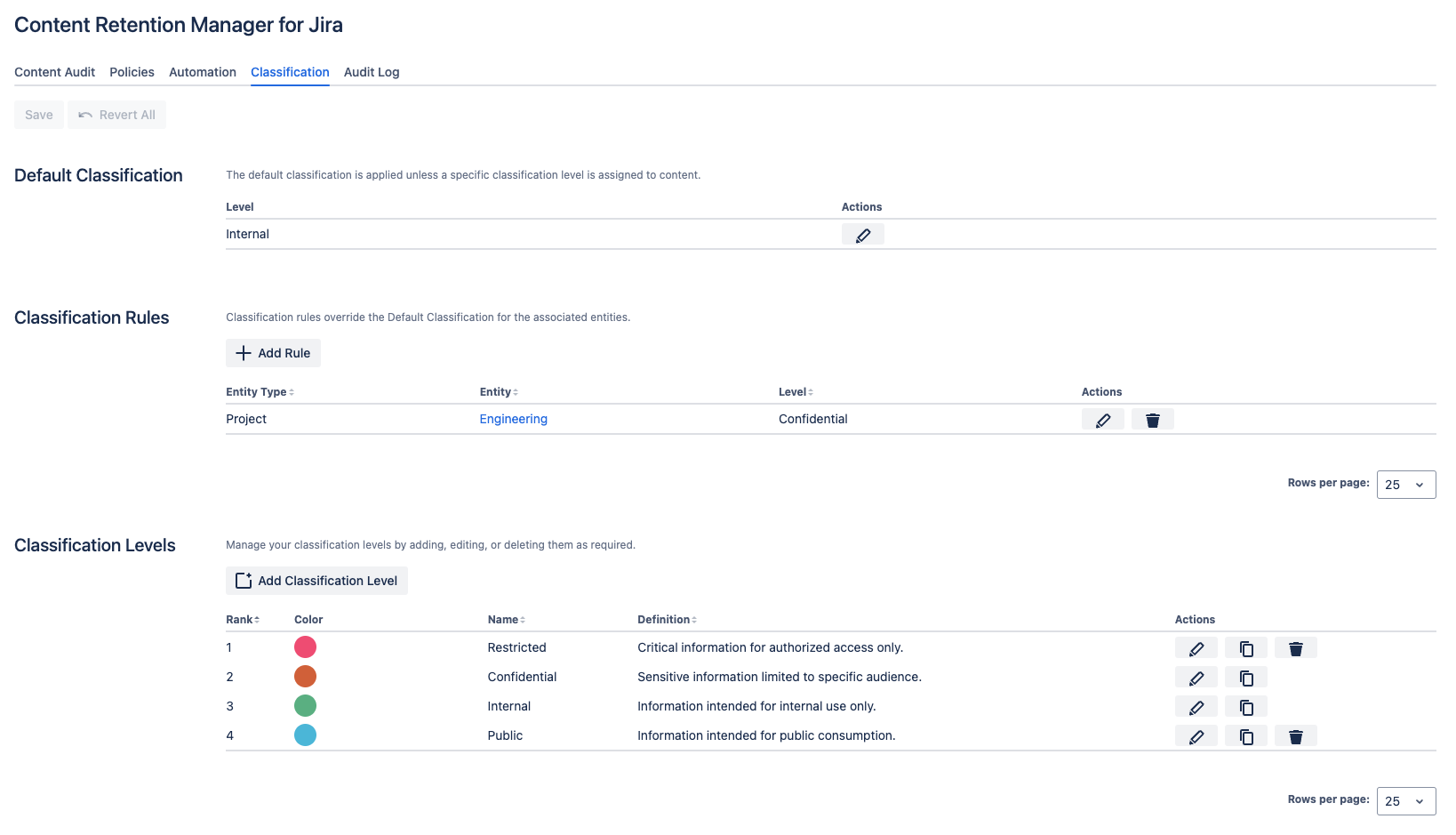 Retention Policies are the primary dimension by which you can gain insights into and manage your content in Jira. As an admin, you can define multiple Policies, assign a global default retention policy, and assign a different policy with Project, User, and Classification Level Retention Rules. Once your Retention Policies are in place you can scan and report on all content in Jira. When you are confident the policies are accurate, you can optionally enable automation to securely dispose of old content that is beyond it’s applicable policy.