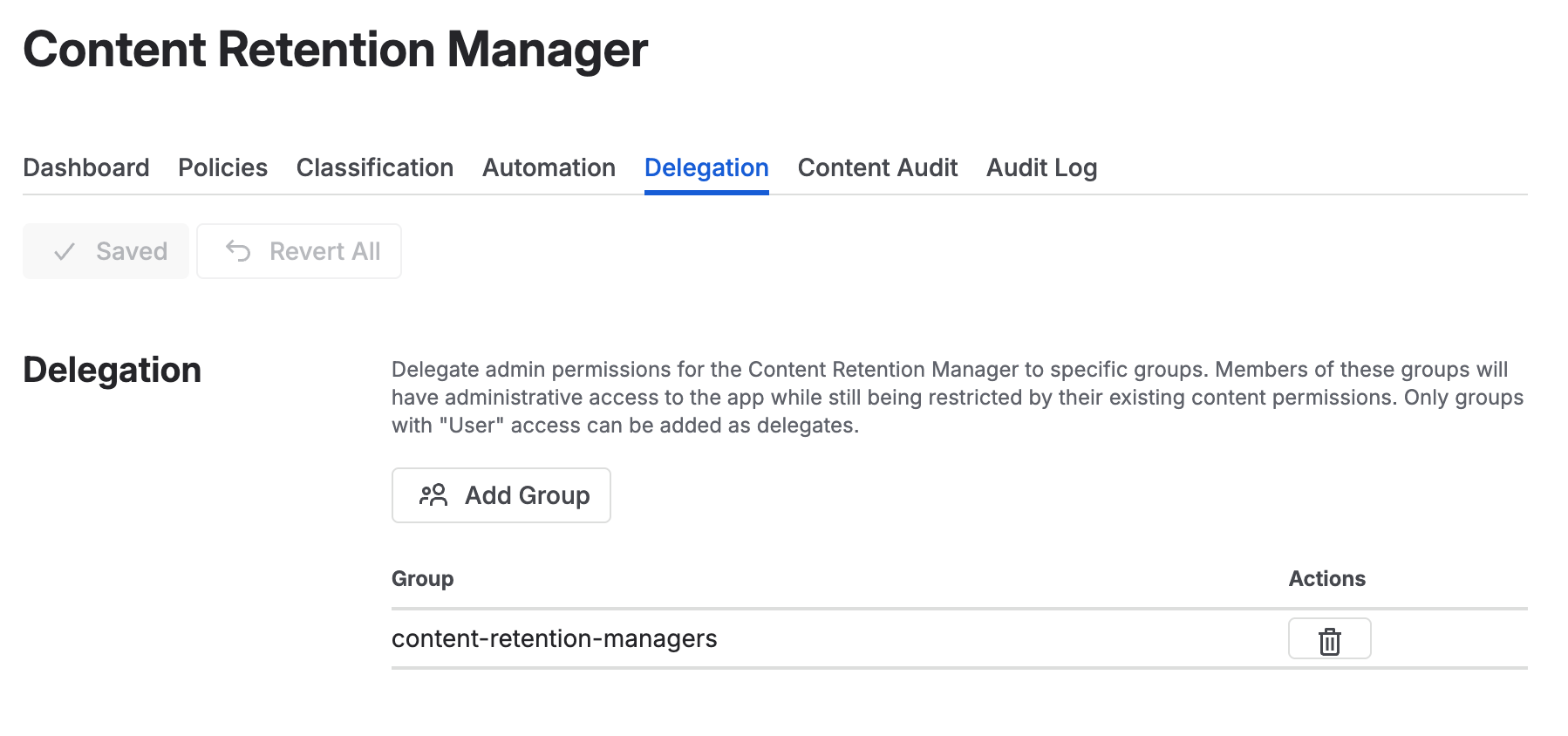 - Adding a user as a delegated admin does not alter their Jira permissions. For instance, if a delegated admin cannot delete an issue in Jira, they also cannot purge it from the Content Audit tab in Content Retention Manager. However, they can influence the issue's lifecycle by modifying policies, classification levels, and enabling automation.