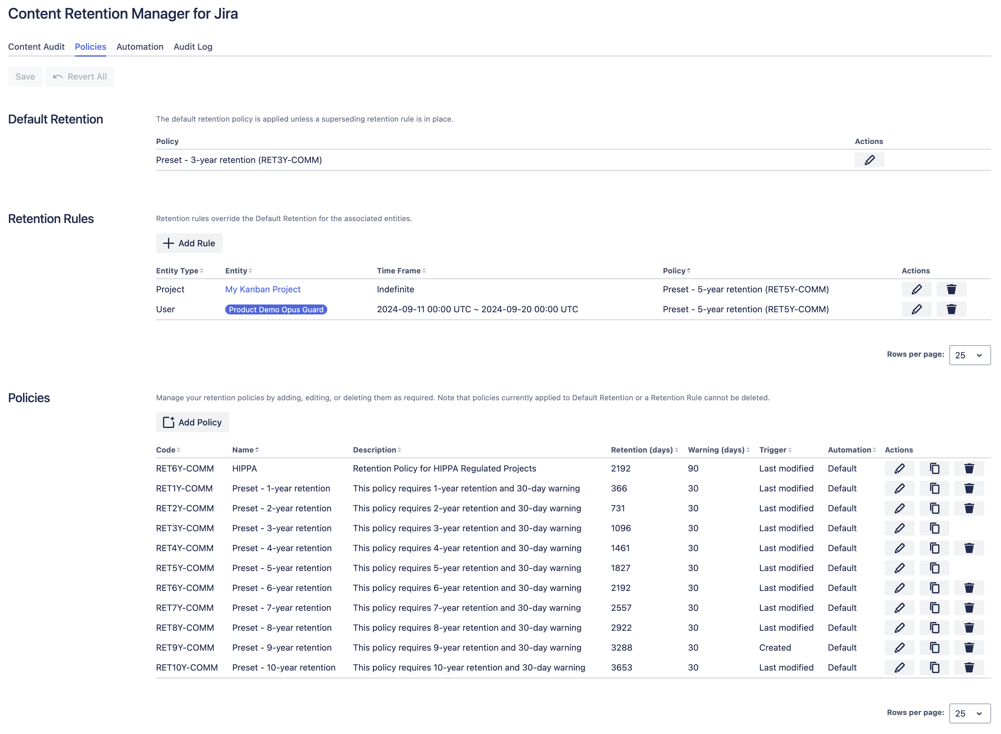 | Policies | Where you create your custom content retention policies to be set against projects or your global default. The days you set will help the audit tool flag all content that is nearing the end of the retention period or has expired past the retention policy. When automation is enabled, Retention Manager will purge content from Jira according to these policies. |